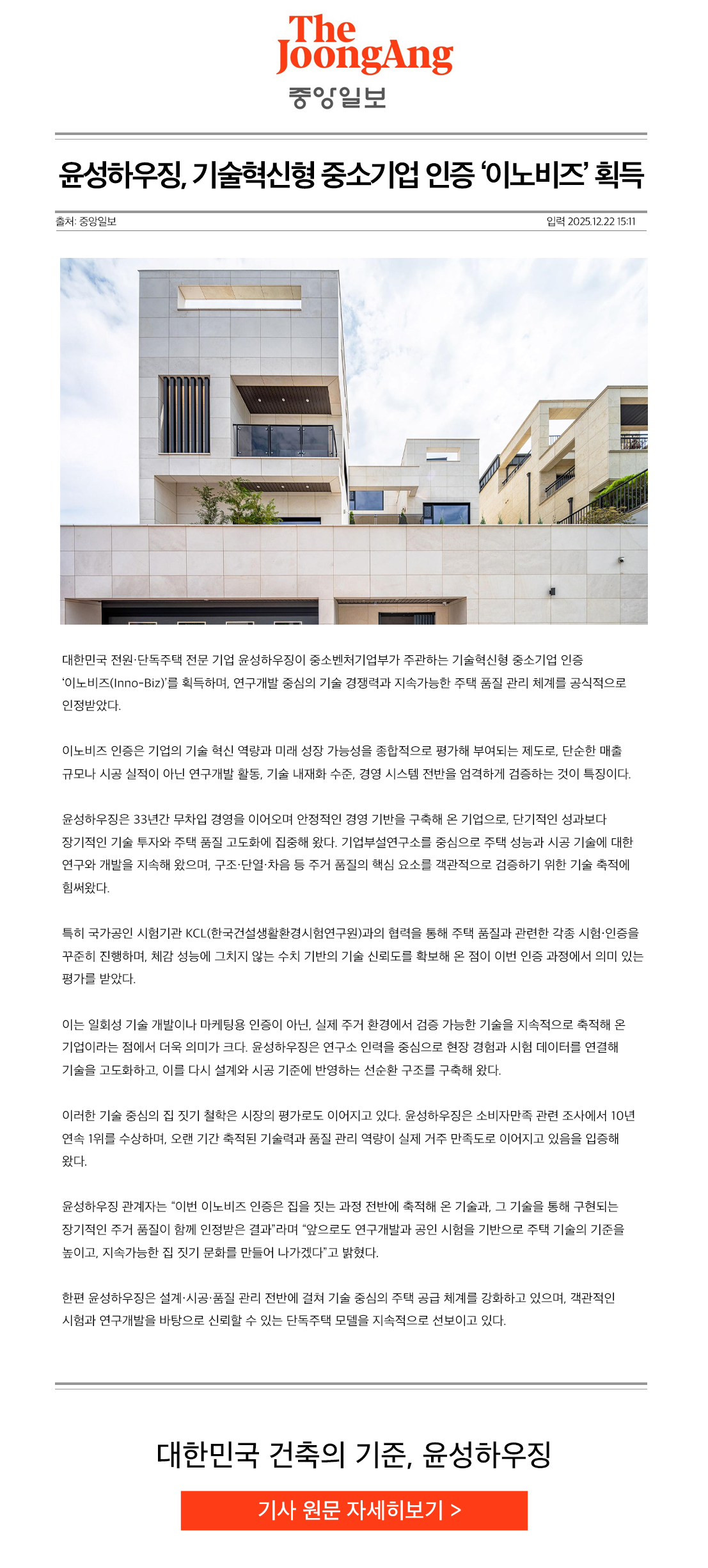 윤성하우징, 기술혁신형 중소기업 인증 ‘이노비즈’ 획득