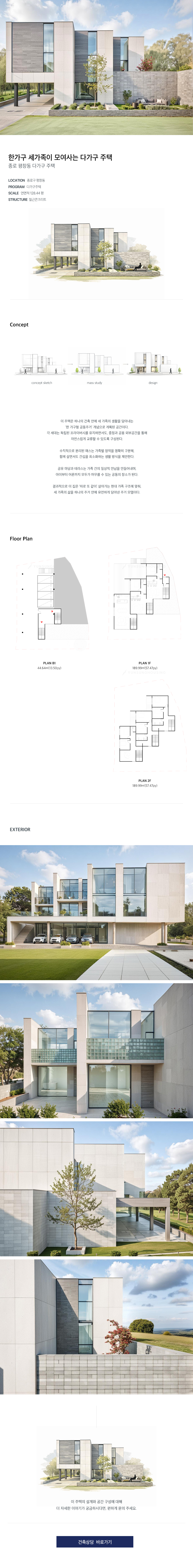 이 주택은 하나의 건축 안에 세 가족의 생활을 담아내는 ‘한 가구형 공동주거’ 개념으로 계획된 공간이다.