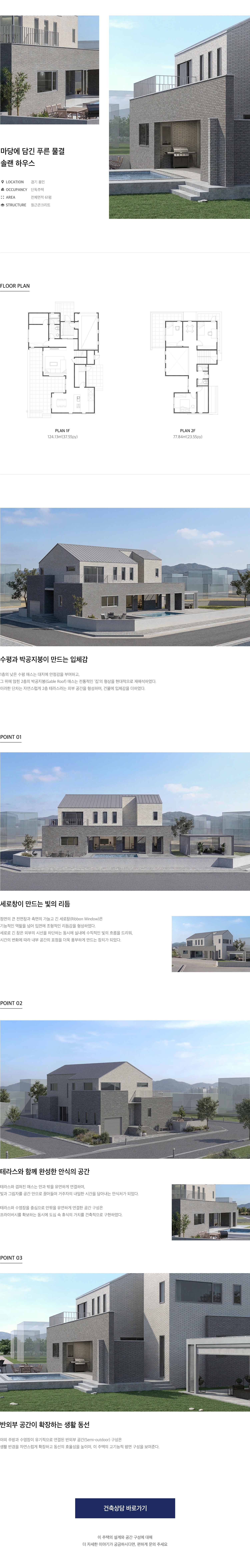 낮고 긴 수평 매스와 박공지붕 매스의 조화를 통해 안정감과 입체감을 담아내고, 수영장과 테라스, 반외부 공간을 중심으로 안과 밖이 자연스럽게 이어지는 프라이빗 하우스로 계획하였다. 길가를 향해서는 닫고 내부를 향해서는 크게 여는 배치를 통해 사생활을 보호하면서도, 빛과 풍경, 물의 흐름을 일상 안으로 끌어들였다. 전면창과 세로창이 만드는 조형적 리듬, 테라스와 수영장이 연결된 공간 구성을 통해 도심 속에서도 여유와 휴식을 누릴 수 있는 주거 공간을 완성하였다.