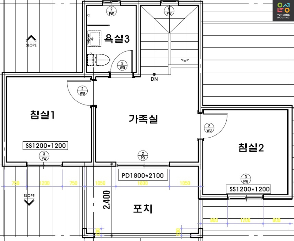- 1층 : 안방(드레스룸/욕실), 서재(2평 내외 작게), 주방, 다용도실등...