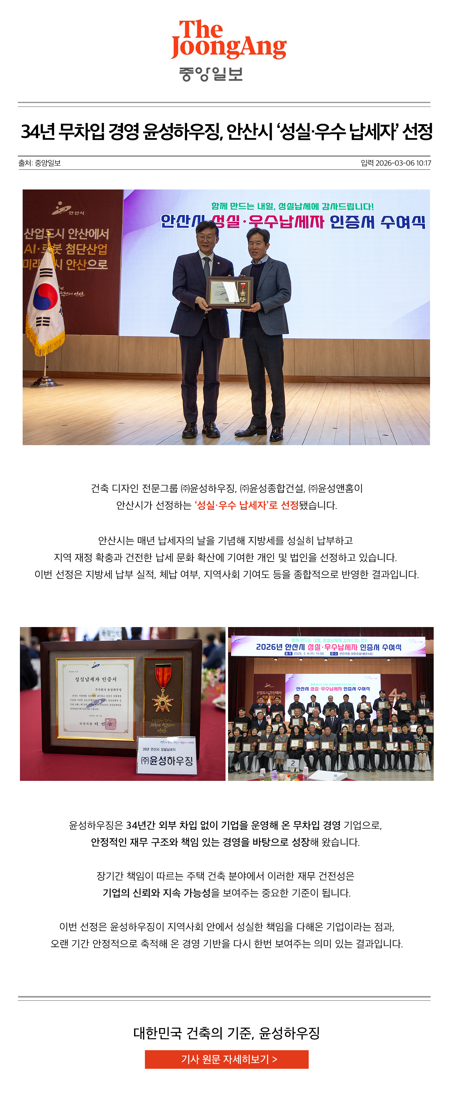 [중앙일보] 윤성하우징, '안산시 성실,우수 납세자' 선정
