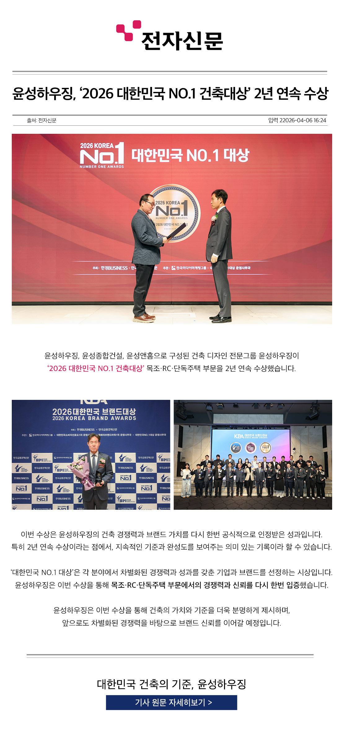 [전자신문] 윤성하우징, '2026 대한민국 NO.1 건축대상' 2년 수상